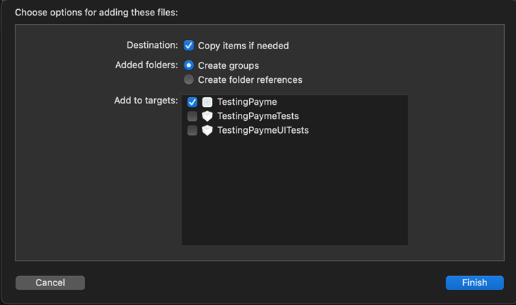 Add Libraries (Payme, SecureKey3DS, VisaSensoryBranding and MastercardSonic) to the iOS project. It is recommended to use "Copy items..." and "Create groups...".
